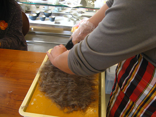 羊毛フェルトの形は自由自在です。ポーチやバック、ストールや、ルームシューズ、マスコットなど…。型を作れば、その通りの形になってくれるのでアイディア次第で色々な作品が制作できます。羊毛フェルトはクッション性、保温性、吸湿性などたくさんの特性があり、フェルトのふわふわとした柔らかさと温かみはとても心地がよいです。出来あがった作品は縫い目がなく、とても丈夫なものになります。基本的に縫い針や糸などはつかいませんので手芸が得意でないという方にもオススメな素材です。羊毛フェルトは常時30色以上取り揃えております。