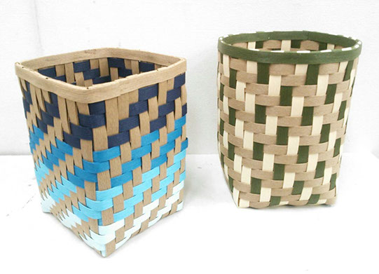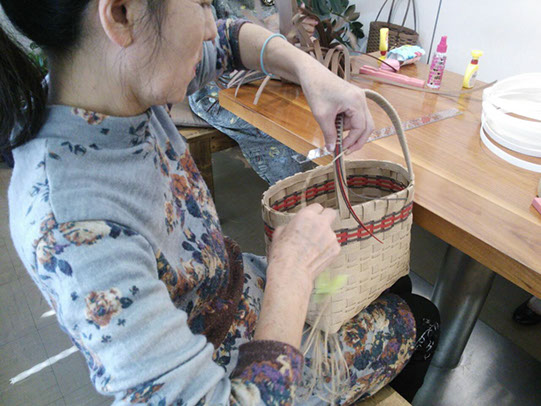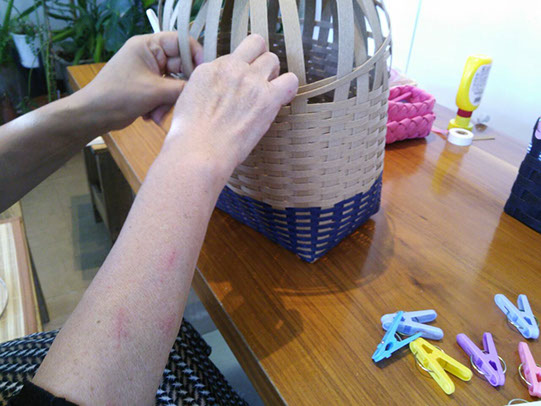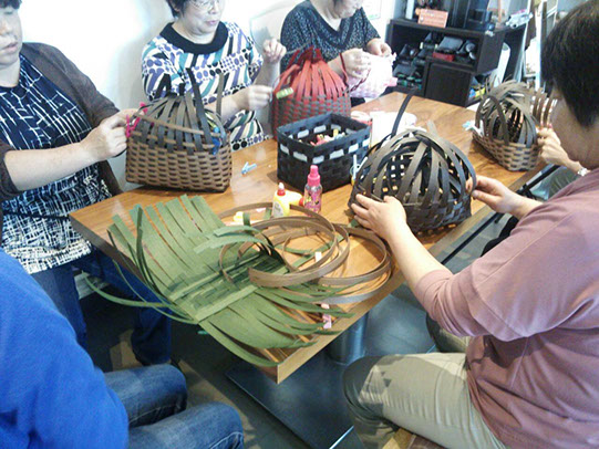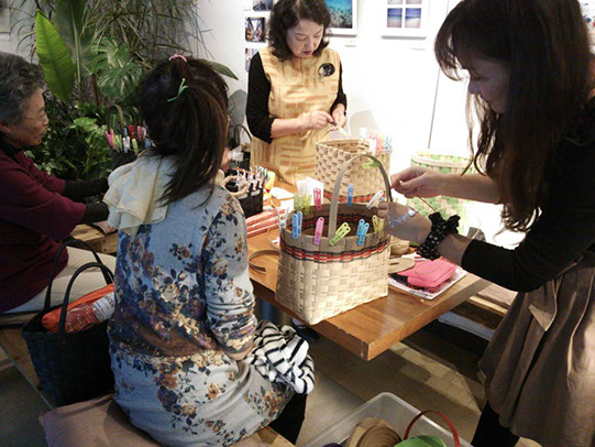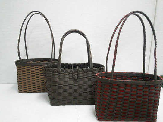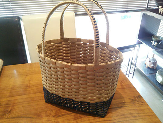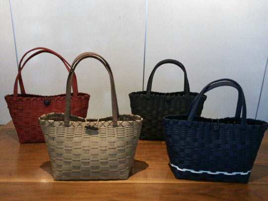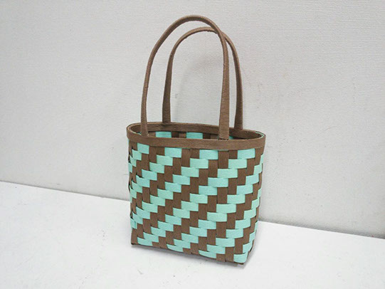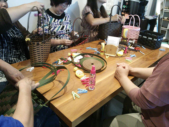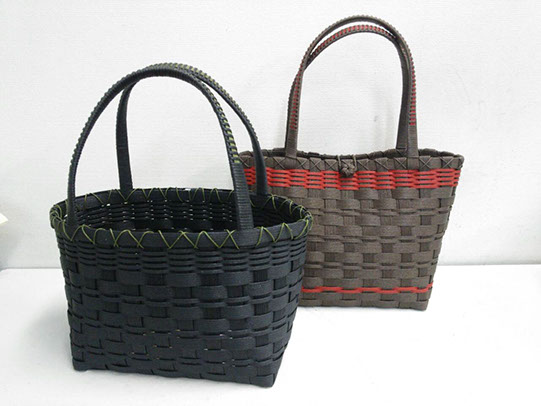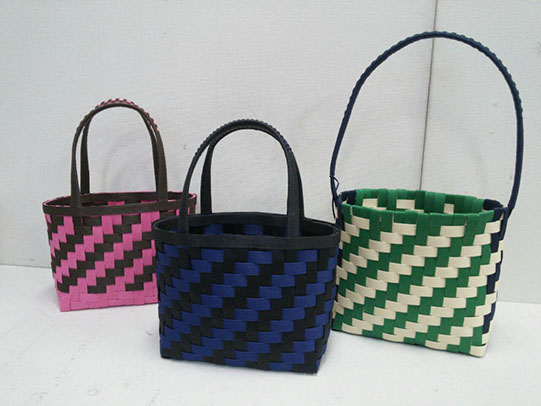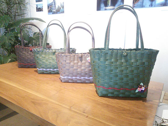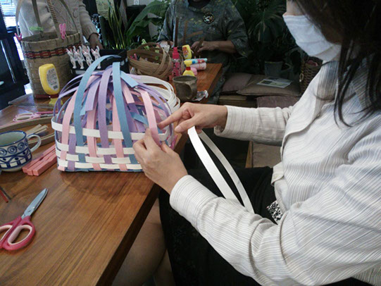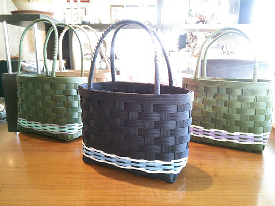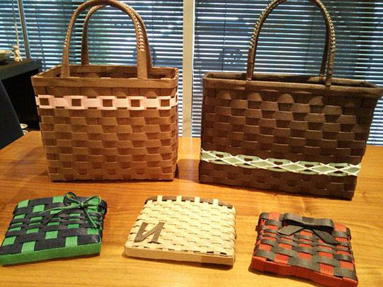 クラフトテープを使ってかごやバック、コースターなどを作っています。編み方、色、形など、組み合わせを変えるだけで全く雰囲気が異なる作品が出来上がります。また約20色の中から使用する分だけの材料を購入できるので、気軽に始める事が可能です。
